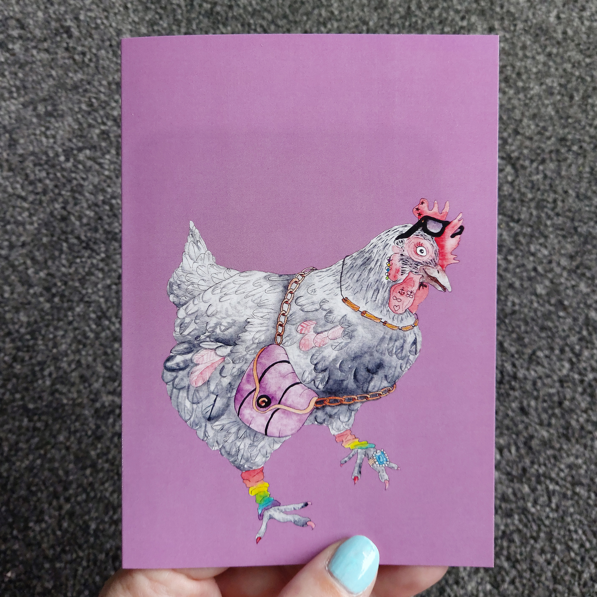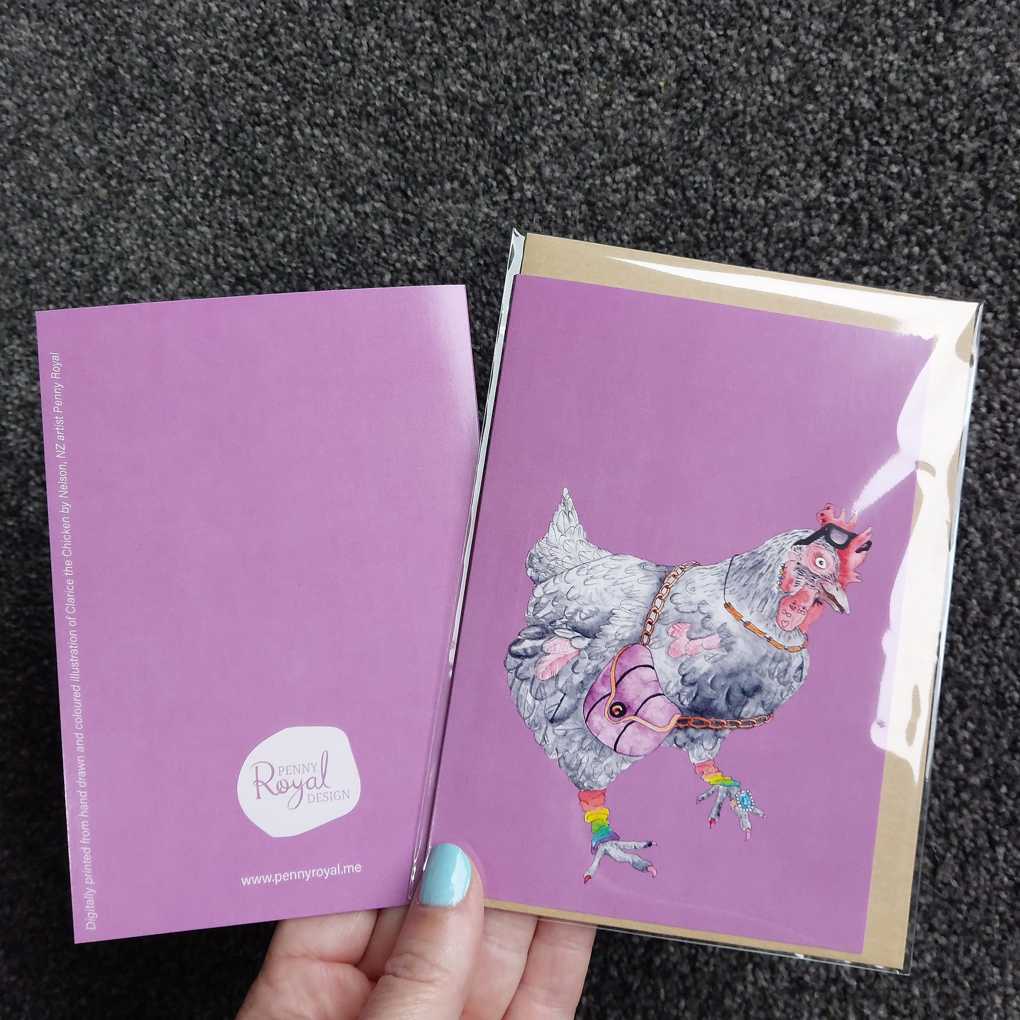 Hand drawn Clarice the Chicken greeting card, full colour with blank inside. Illustration details on the back of card.