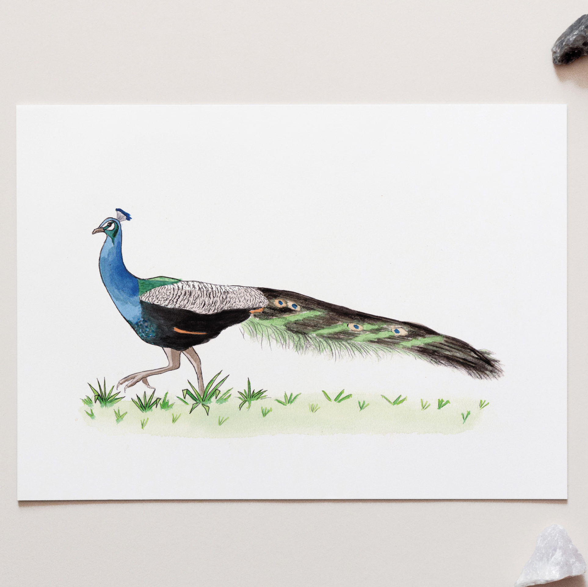 Digital art print created from hand drawn and watercoloured Peacock by NZ Artist Penny Royal.
