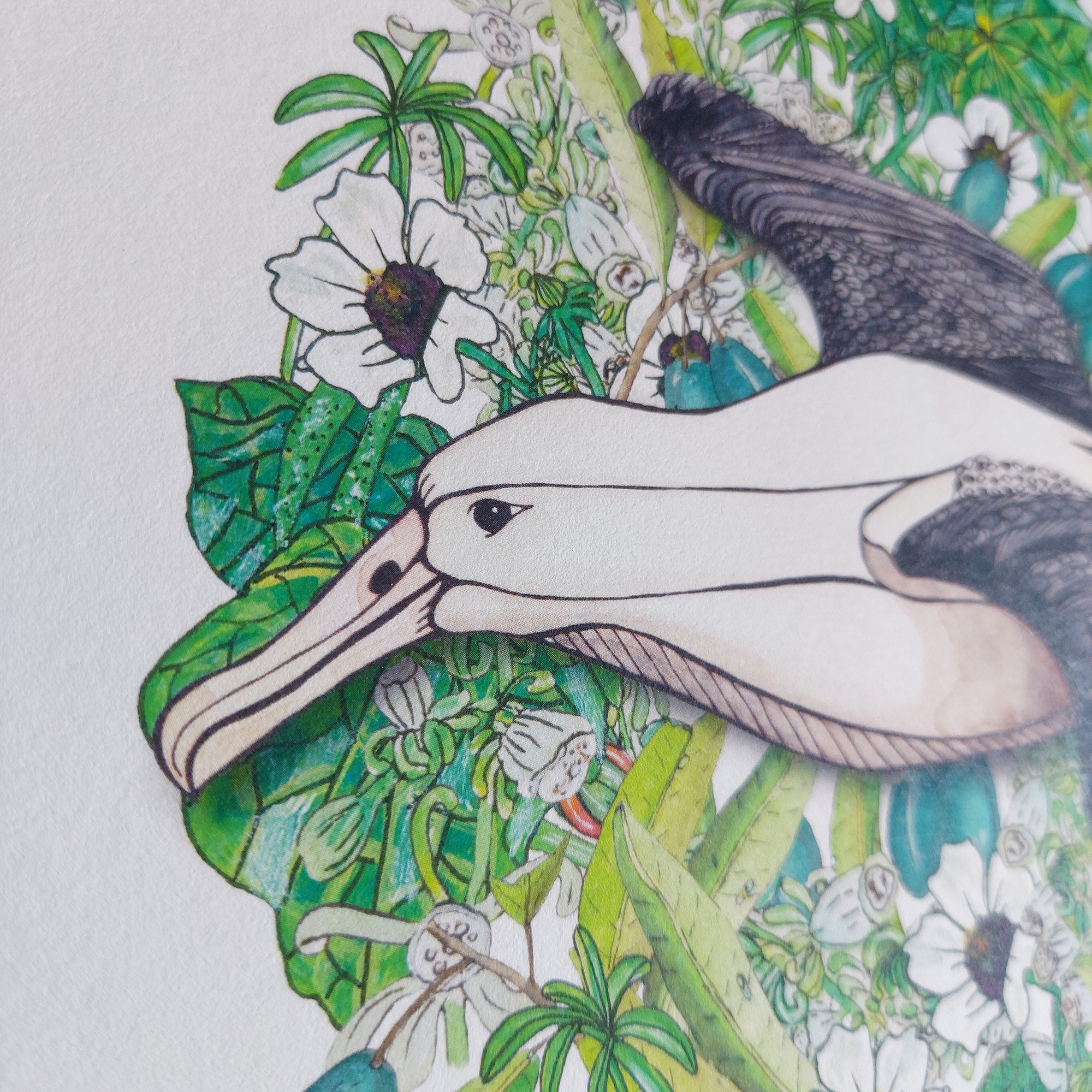 Lesh Creates and Penny Royal Design have joined forces for an exceptional artist collaboration project. Witness the captivating fusion of their combined talents as they expertly blend their illustrations, creating a spellbinding masterpiece that will truly amaze you. This contemporary art print features a Royal Albatross against a backdrop of NZ Native fauna. The artists have digitally signed this one-of-a-kind artwork.