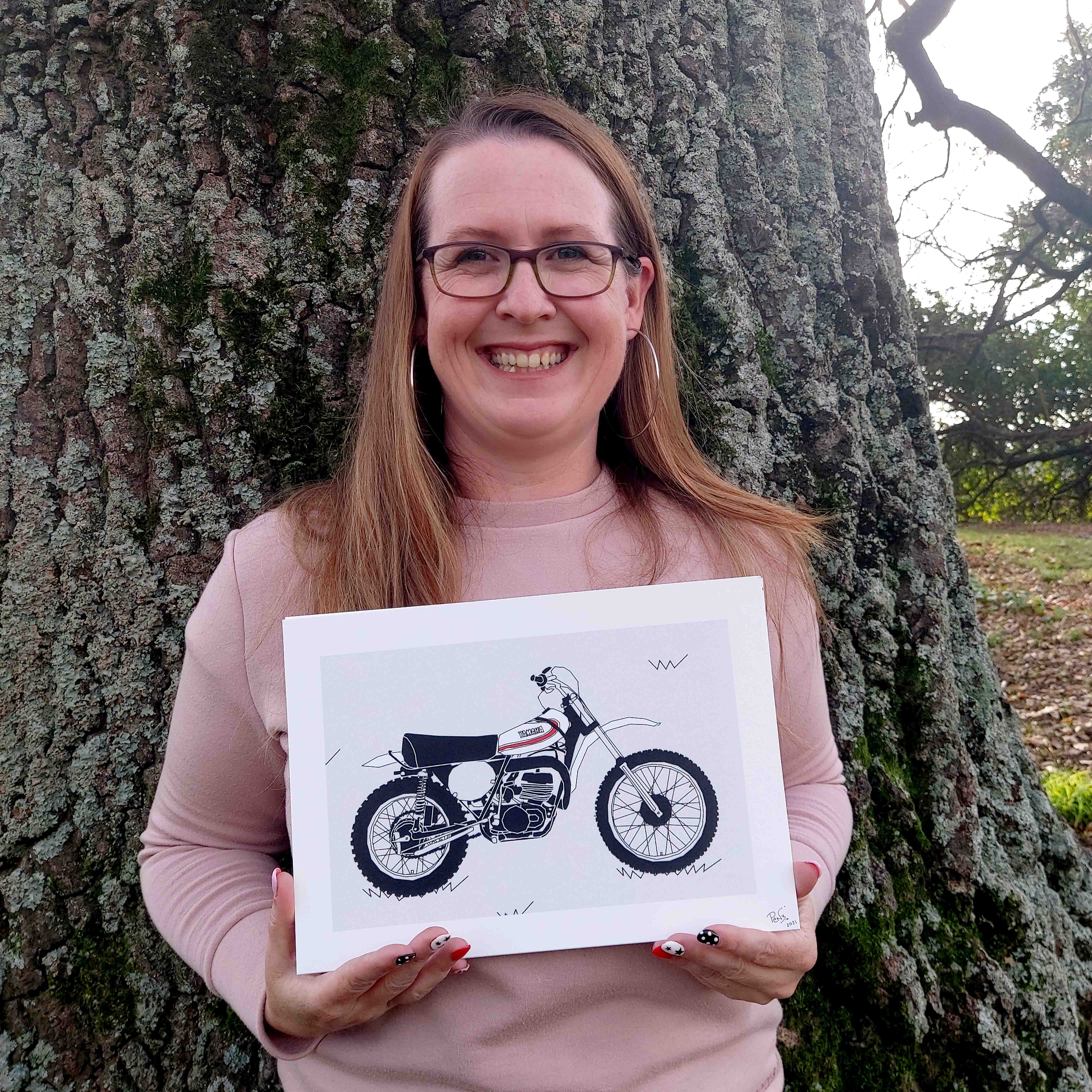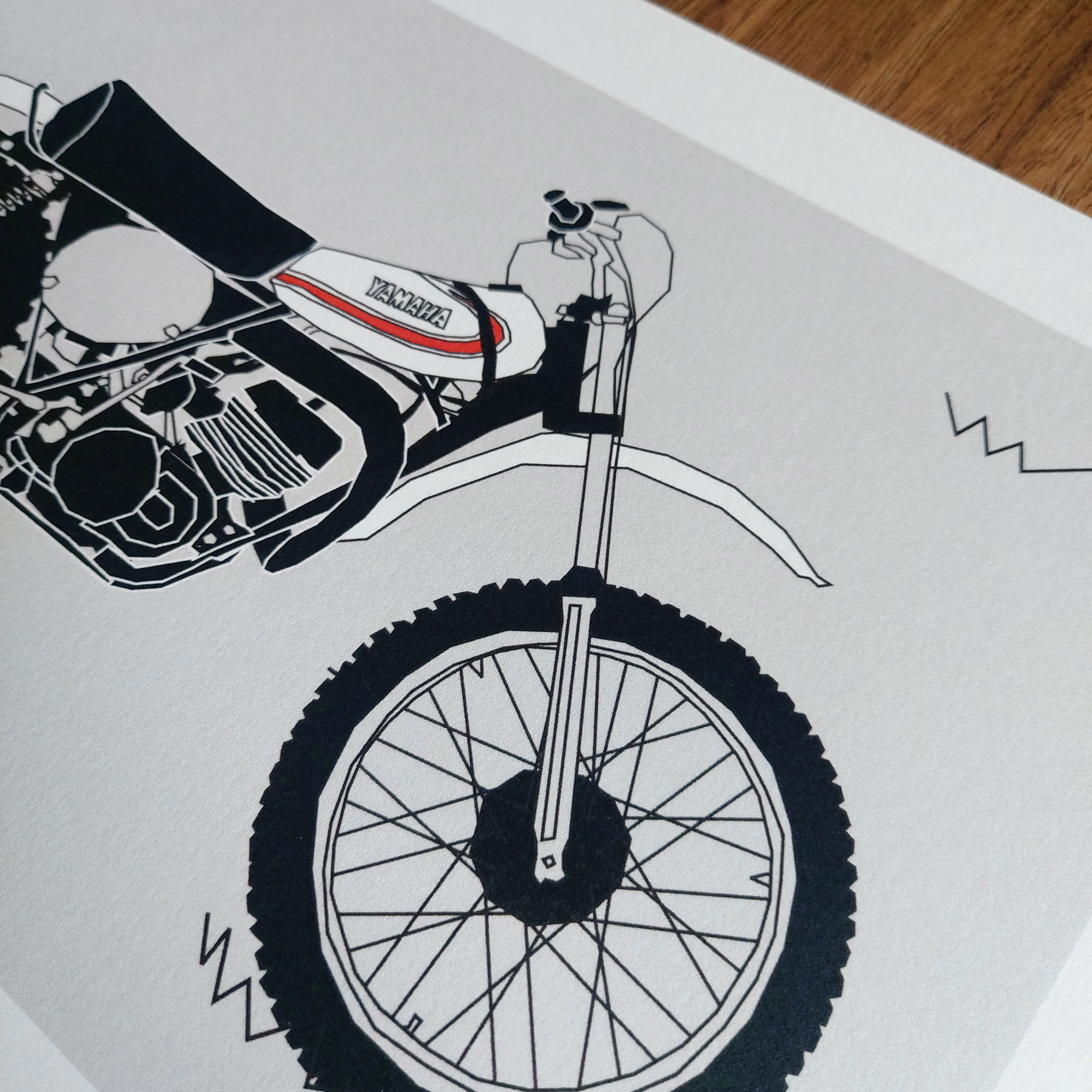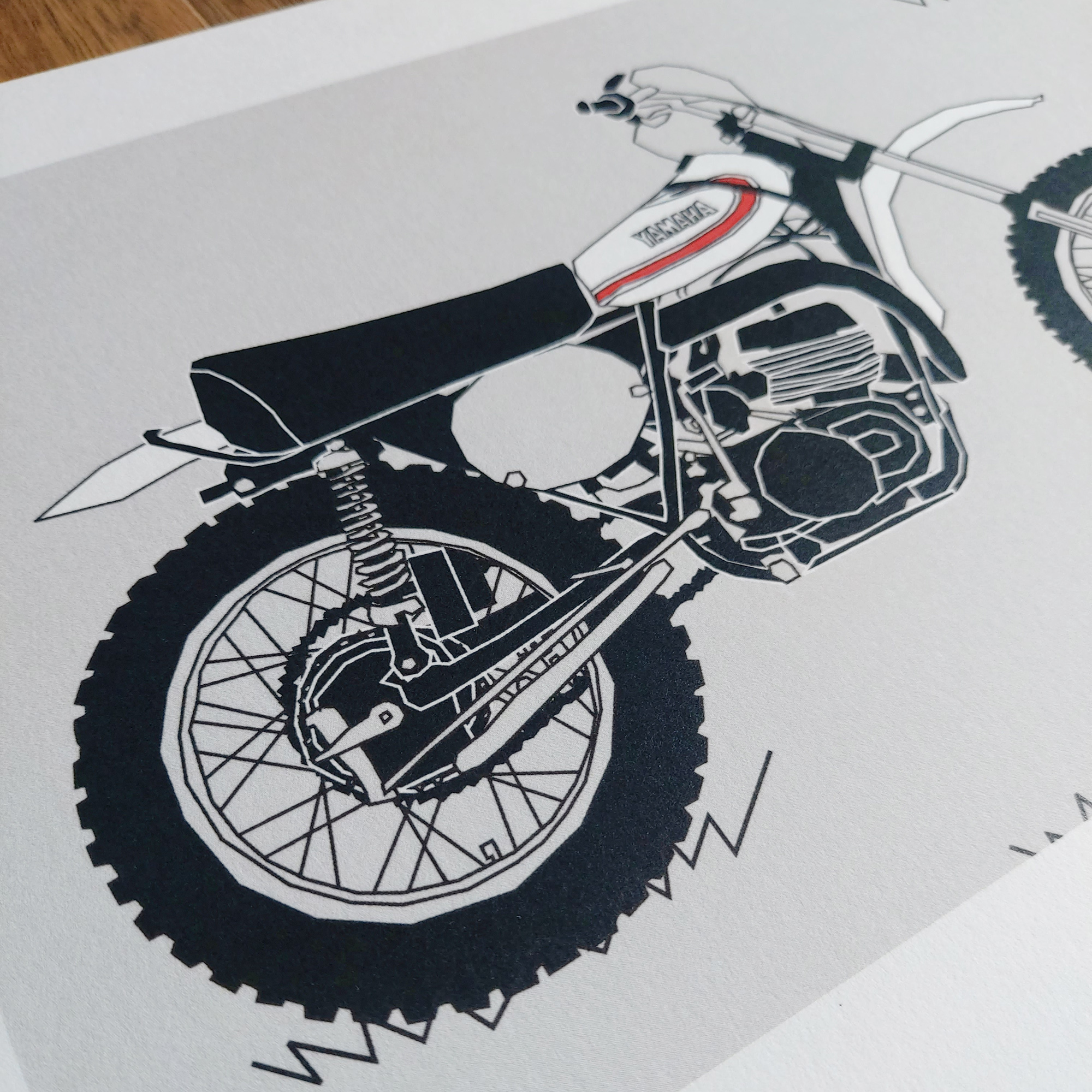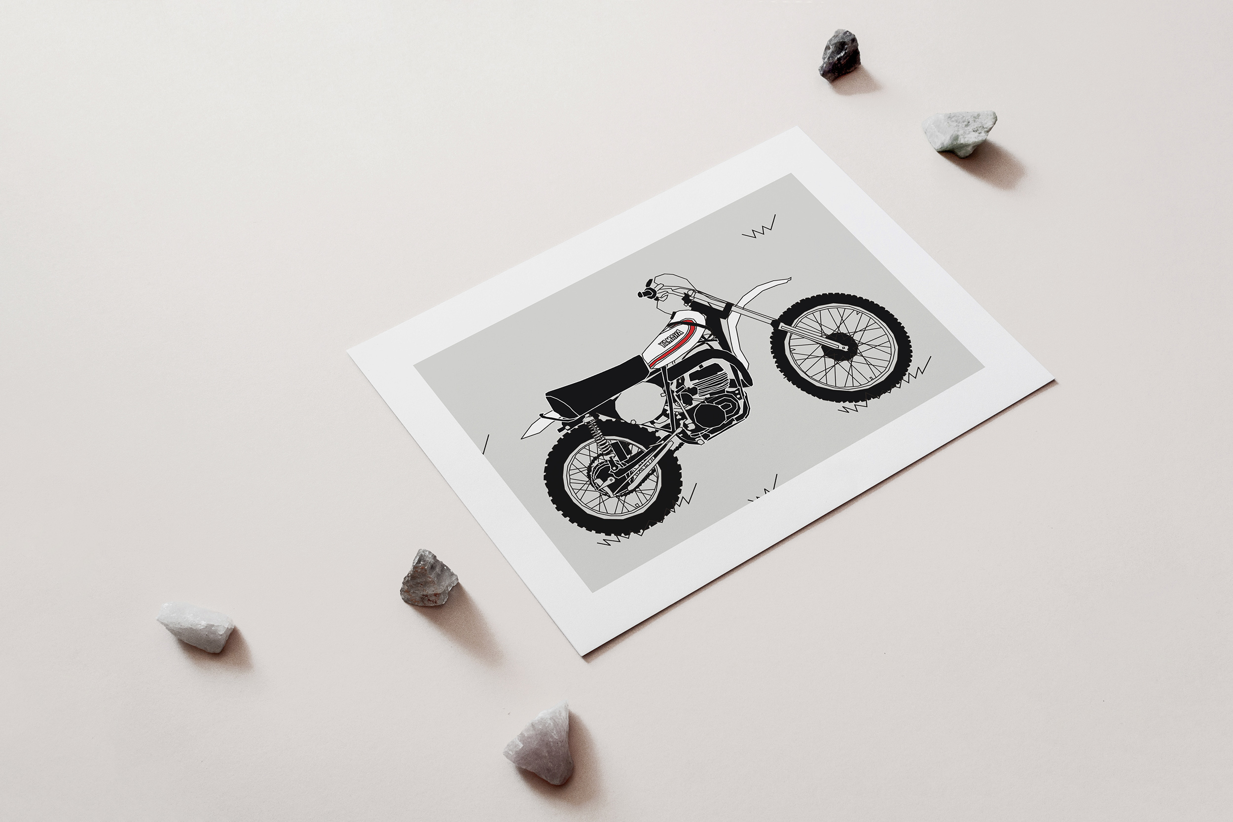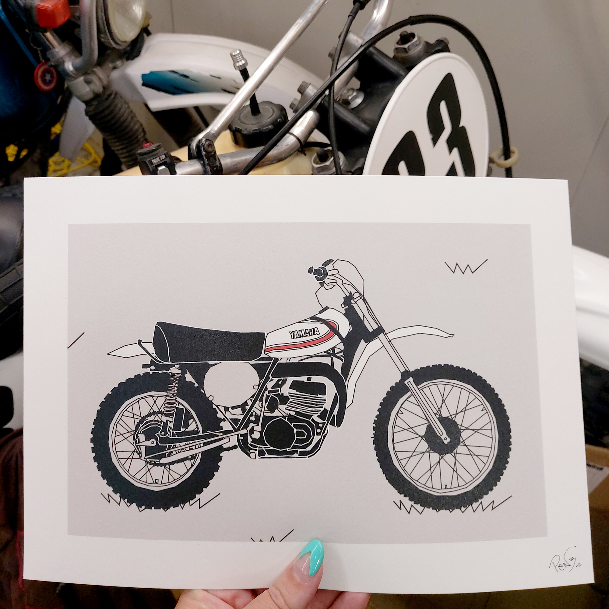 Delve into the digital rendition of a 1973 Yamaha YZ250 Classic Motocross bike, crafted by New Zealand artist Penny Royal.
